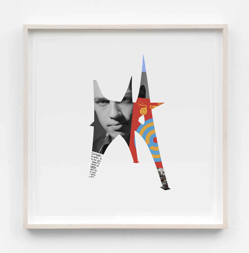 The Insight series is a suite of 30 large-scale collages of variable dimensions. The individual compositions each reveal themselves within the silhouetted shape of an iconic work of contemporary sculpture. In doing so, they perform a delicate two-step: first by turning a three-dimensional sculpture into a flat graphic shape, then by creating a new, reimagined depth through stacked and layered elements. The sculptural object dematerializes and becomes a window; its signature outline becomes, in photo-compositing jargon, a “mask.” Perhaps a reminder that we only ever see the world through our individual, unique sets of limitations—our frames, our blinders, the slit in our veils.